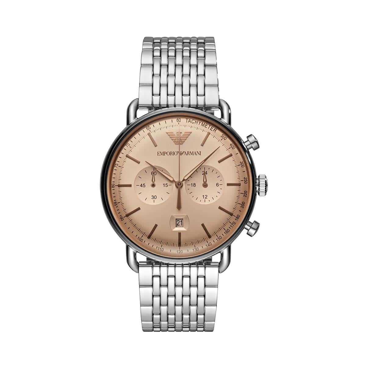 Cadran : Noir, avec des détails simples et épurés. Le cadran présente des index bâtons argentés, des aiguilles argentées, ainsi que le logo Emporio Armani à la position de 12 heures.